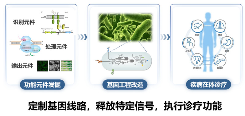 构建工程化益生菌用于疾病的在体精准诊疗。以益生菌为底盘细胞,设计构建胞内传感、记录、调控等不同代谢功能模块,赋予工程化益生菌智能感应及原位诊疗功能,实现全细胞对肠道疾病及代谢性疾病的及时诊断和治疗的目标。