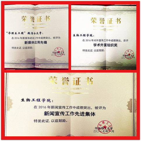 获得“新闻宣传工作先进集体”、“新媒体应用先锋”和“学术外宣组织奖”,张元兴、谭文松、刘少伟3位同志荣获“华笙奖”,占全校5个“华笙奖”名额中的3个,李阳被评为“新闻宣传工作先进个人”、肖婧凡、富琳桦获得“优秀通讯员”称号,阳大海的文章《免疫学顶级杂志Immunity报道华理感染免疫学研究新进展》获得“好新闻”二等奖,还有9位教师获得“学术外宣奖”。
