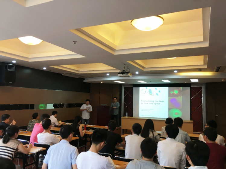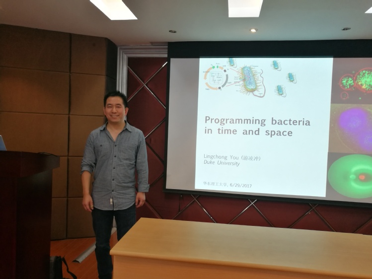 及生物反应器工程国家重点实验室。院长庄英萍教授与游凌冲教授就科研合作、未来学生交流培养等方面展开了深入交流和讨论。随后游凌冲教授在实验18楼315会议室作了题为“Programming bacteria in time and space”的精彩学术报告,学院副院长王启要教授、钱江潮教授等教师和同学参加了学术报告会,报告会由吴辉副教授主持。