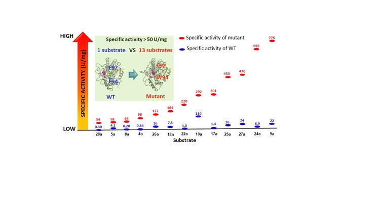 近年来,我国传统的化学化工及相关制造业面临着巨大的环保压力和节能减排的挑战,以工业酶为核心的生物合成技术,可以显著降低生产过程中的资源与能源消耗,减少污染物的排放,成为了企业创新驱动、转型发展、依法减排所亟需的的先进制造技术。然而天然来源的酶通常无法满足实际应用环境中的苛刻条件,因此需对其工业应用性能进行提升。针对野生型羰基还原酶CgKR1底物谱不够宽、催化活性不够高的缺陷,研究人员基于分子动力学模拟分析和长期的研究工作积累,推断出酶的底物通道上可能影响活性的两个关键氨基酸残基Phe92和Phe94;通过对酶进行结构改造,获得了一个对28种羰基底物催化活性显著提高的突变体CgKR1-F92C/F94W,并成功用于多种药物手性中间体的扩大制备。这一广谱、高效的生物催化剂为PornZog