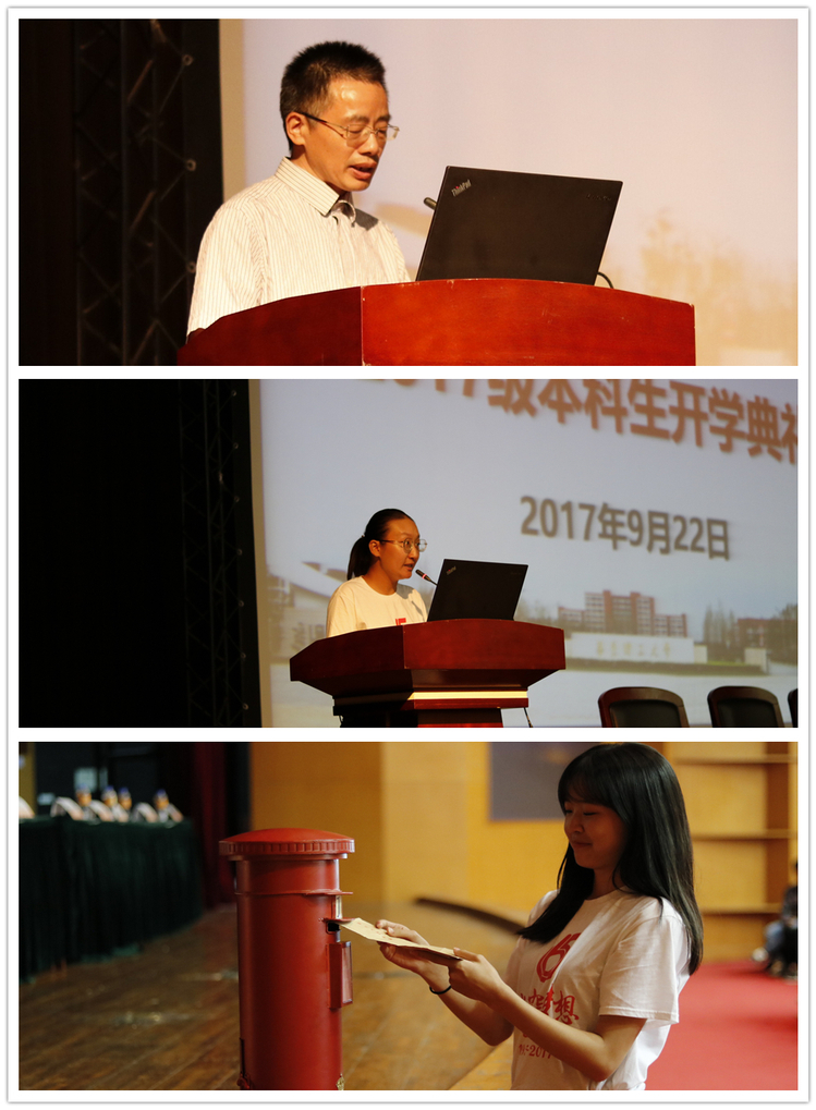 来自生物171班的张致同学作为新生代表发言,表达了对大学生活的美好憧憬和向往,并以“选择生工,探索生工” 为主题号召全体新生努力求知,不负青春,不负韶华。尤为惊喜的是,生物工程学院2017新生开学典礼精心设置了“我的生工+”特别环节,357名新生撰写了“致四年后的自己的一封信”,由新生代表南妍、陈滟陇投递至特制信桶内,最后由院长庄英萍和学生代表陈宇清共同封存,激励同学们用四年的时光书写更美好的自己。