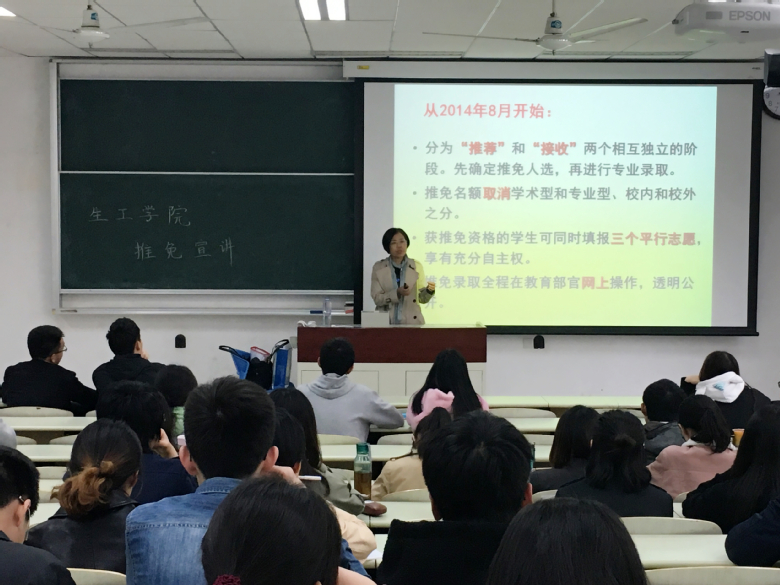 生物工程学院2019届推免宣讲会于4月16日中午在奉贤校区D教举行。会议由生物工程学院副院长卢艳花主讲,2015级辅导员邓亚珊主持,共计70余名同学参加了本次宣讲。