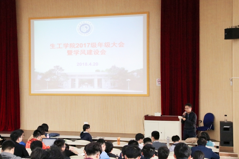 2018年4月20日,生物工程学院在奉贤校区A200教室召开2017级学风建设暨大类招生专业分流动员会,副院长王启要教授、学工委主任吴蓉老师、各系主任、班导师代表莅临现场为同学们答疑解惑,2017级全体学生出参加了此次会议,会议由2017级辅导员徐亚飞主持。