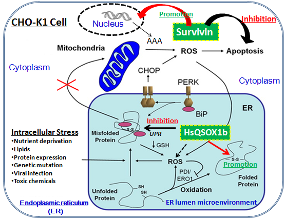 本研究基于细胞合成生物学理论,利用CRISPR/Cas9基因编辑先进技术,对常规市售CHO-K1细胞开展了人源HsQSOX1b和Survivin的双基因精准编辑,在建立快速高效的宿主细胞改造技术平台的同时,并以eGFP和GLuc2种蛋白为示范,在探究内质网中二硫键形成与蛋白质折叠、内质网未折叠蛋白应激反应(UPR)和细胞抗凋亡三者之间的分子机制基础上,成功地获得了比未经编辑的对照细胞株抗凋亡能力提升6.4倍、目的模式蛋白产量提高5.5倍的双基因编辑细胞株(CHO-K1-EC2) , 这将为我国从源头强化抗体高效生产细胞株提供了重要的理论依据,同时有望为我国广大民众未来用得起价廉、安全、高效的生物技术药物提供重要的技术支撑。