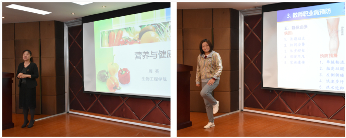 活动伊始,食品系周英同志的“健康饮食”微讲座为活动拉开序幕,报告贴近生活、生动有趣,阐述了饮食与健康的密切联系。接着,体育学院陈婧同志“高校教师健康状况及职业病预防”的专题报告,动静结合,结合视频为党员们现场指导《八段锦》健身操的练习。姚文、陆兵对本次活动进行了点评,希望建立长效机制共同探索更多途径为满足人民对美好生活的需要不懈奋斗!