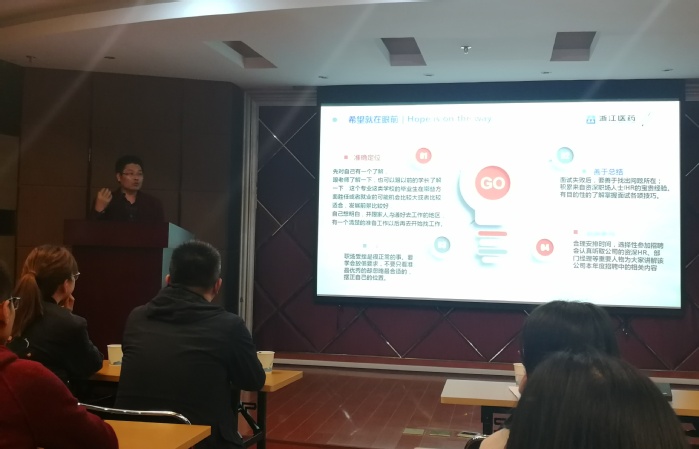本次活动首先邀请了上海透景生命科技股份有限公司应用工程部总监张晓锋从“我是怎么面试”的角度,为准研究生们分享了在面试过程中需要注意的事项。随后,上海透景生命科技股份有限公司人事部容妍洁总经理以“求职经验分享”为题,从简历书写到面试细节问题等方面为大家做了相关经验分享。最后,浙江医药股份有限公司招聘主任唐仁喜总经理以“职步向前·相约在浙”为题,从秋招和春招的重要性、简历制作技巧和如何应对面试等方面,从企业角度为学生提供了求职参考。活动由生物工程学院研究生兼职辅导员阳大海副教授主持,2016级研究生兼职辅导员辛秀娟副教授和部分准毕业研究生和本科生参加了本次活动。