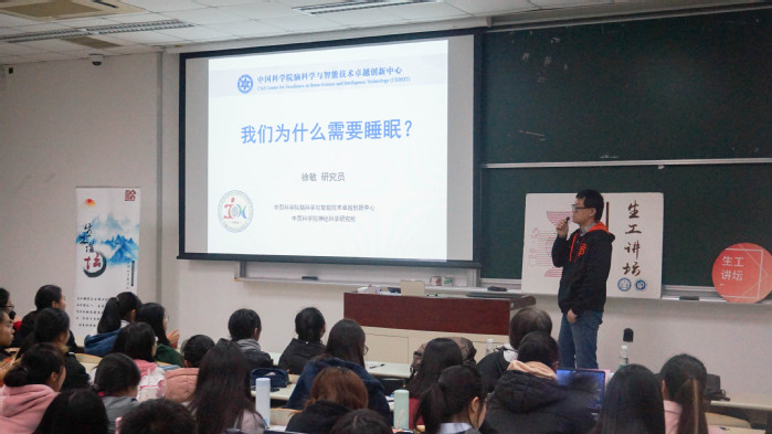 2018年12月6日晚18.15-20.15,华理生物工程学院毕业学长、现任中国科学院上海生命科学研究神经科学研究所研究组组长的徐敏研究员做客102期生工讲坛,带领大家走进睡眠的奥秘。生工学院应用生物学系主任吴海珍教授与两百多名学生共同参与了活动。