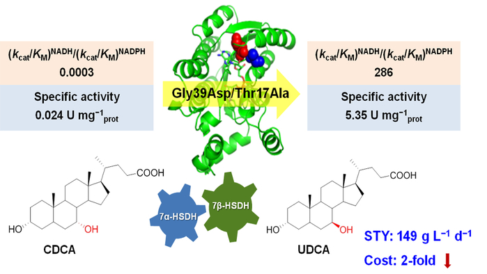 本研究提出了一种辅酶特异性反转-小巧突变库的设计策略(CSR-SaSLiD),理性地设计了一个包含五个突变子的小巧定点突变库,从而快速地筛选到辅酶偏好性反转且活性较高的突变体。相较于母本,Rt7β-HSDHG39D实现了辅酶偏好性由NADPH到NADH约953,000倍的反转,Rt7β-HSDHG39D/T17A对NADH的活性提高223倍。随后,研究者利用分子动力学模拟解释了辅酶偏好性反转及活性提高的分子机制,并将CSR-SaSLiD策略应用于另外两个7β-HSDHs的辅酶偏好性反转和活性提升,得到了类似的结果,表明CSR-SaSLiD是一种有效的改造策略。最后,将所得最好的突变体Rt7β-HSDHG39D/T17A应用于酶法转化鹅去氧胆酸合成熊去氧胆酸,时空产率达149 g L-1 d-1,成本降低了2倍,表明Rt7β-HSDHG39D/T17A可以用于高效、低成本可持续制备熊去氧胆酸。这将有助于加快熊去氧胆酸的工业化生物合成进程,从而有望彻底解救因“活熊取胆”而遭受悲苦命运的黑熊。