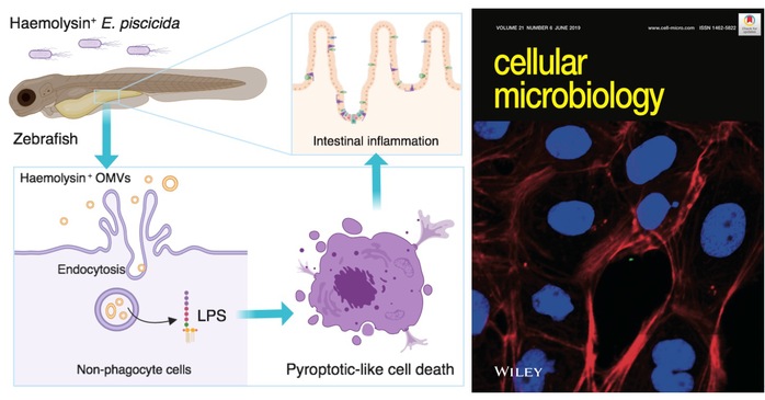 课题组以海水养殖关键病原杀鱼爱德华氏菌为研究对象,建立了斑马鱼非吞噬类细胞感染模型,采用转座子突变体文库技术,筛选获得一株溶血素上调表达菌株,发现它们能够引起鱼类细胞产生caspase-5活性依赖的焦亡效应。在此基础上,论文详细解析了杀鱼爱德华氏菌溶血素搭载细菌外膜囊泡(OMV),并通过dynamin依赖的内吞途径将病原毒力因子投递到细胞质的分子机制。然后,在斑马鱼成鱼和幼鱼活体上建立了浸泡感染模型,解析了细菌溶血素促进鱼类肠道炎症发生的抗感染机制。上述研究工作为深入理解病原细菌溶血素及其致病性提供了新思路,为研究低等脊椎鱼类细胞焦亡的调控信号提供了新线索。