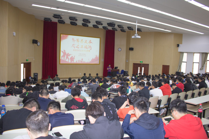 徐亚飞向同学们讲述了中国近现代史和中国国防力量发展壮大的历史,以生动的案例向同学们阐释民族复兴的中国梦需要坚强国防来支撑,强调高素质优质兵源对于发展机械化、信息化国防的必要性,鼓励在座的学生积极投身军营,为现代化国防做出贡献。