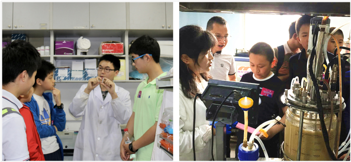 之后的科学体验环节同学们在实验室研究生的带领下现场体验了微生物大规模培养关键步骤—菌种接种的操作,并现场观看了微生物实验室规模发酵演示,随后实验室副主任肖婧凡副教授带领大家参观实验室,并进行了详细的介绍,让同学们了解了智能生物反应器在工业化生产中的应用