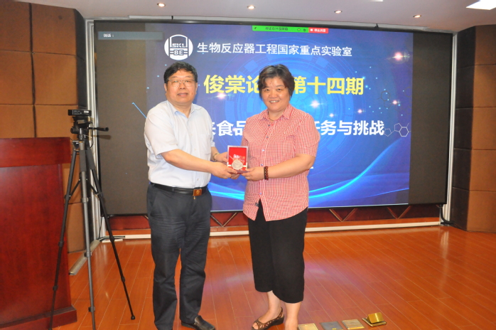 陈坚院士主讲的论坛报告圆满结束后,庄英萍教授代表学院和重点实验室向陈院士赠送了“俊棠论坛”银质纪念奖牌。