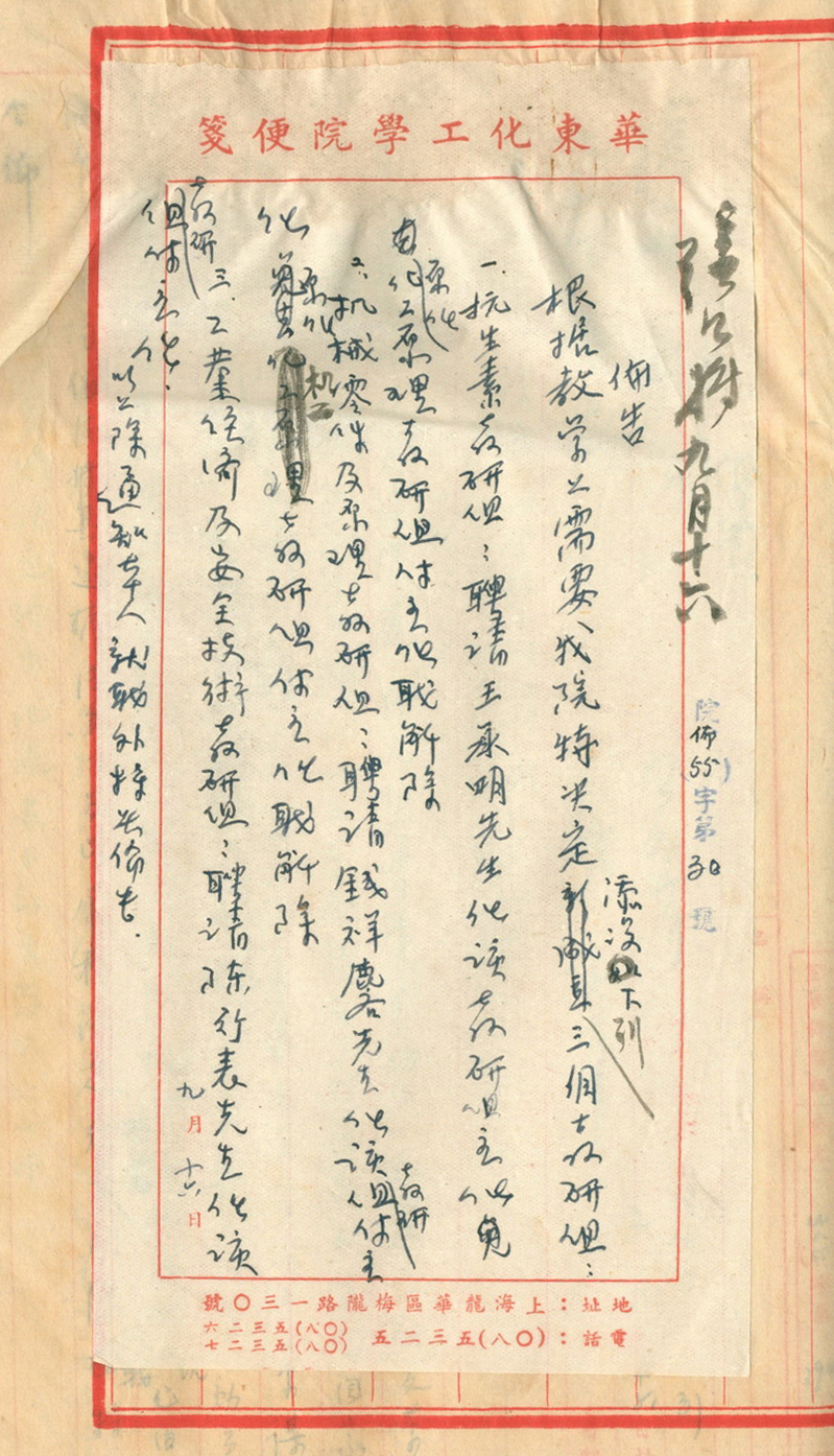 由于当时中国急需抗生素生产技术人才,化工部医药局提出要加速建设抗生素制造工学专业,早出人才。经学校研究决定和医药局同意将化学制药工学专业1953年和1954年进校的学生抽调部分转入抗生素制造工学专业学习,因此华东化工学院抗生素制造工学专业在1957年就有首届毕业生,这也是中国自己培养抗生素制造工程技术人才的开始。