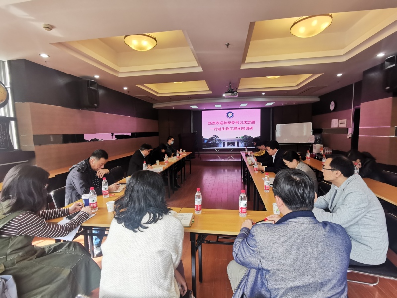赵黎明首先向沈书记一行介绍了学院党委的工作总思路和特色工作,并就学院落实全国抗击新冠肺炎疫情表彰大会精神的情况、落实全国研究生教育会议精神的情况、推进“四史”学习教育的情况、落实制止餐饮浪费行为的情况、统筹实验教学和疫情防控常态化的情况、落实学校党委安全工作部署的情况、谋划学院发展情况等七个方面的调研内容作了汇报。与会师生代表逐一发言。最后,沈志超书记对生物工程学院近期所取得的工作成绩给予了充分肯定,他表示,生物工程学院这段时间所做工作比较扎实,并指出,学院党委要在谋划学院发展上明确“把方向、管大局、出决策、保落实”的职责。2020年是生物工程学院“建章立制”之年,规章制度制定好,关键要看落实。学院发展的关键要搞好基层党建工作,目前基层党建比较薄弱,要找出问题所在,充分发挥二级党组织战斗堡垒作用,为学院发展凝心聚力。同时,他对汇报中七个问题尤其是学院谋划发展、研究生培养质量特别是高端人才的培养、实验室安全等情况一一提出了自己的具体意见和看法,并进一步指出学院下一步努力的方向。纪委周容、马小雷、郭卫斌等老师一同参加调研。