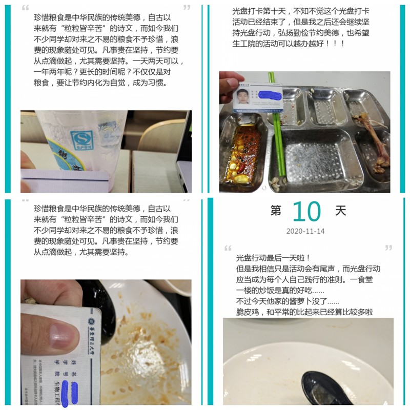 为践行节约粮食准则,倡导新时代青年人履行“一粥一饭,当思来之不易;一丝一缕,恒念物力维艰”的行动,生物工程学院于11月5日至11月14日举行为期十天的光盘打卡行动。本次活动中,同学们踊跃参加,分享品尝美食的快乐以及光盘行动中的心路历程。