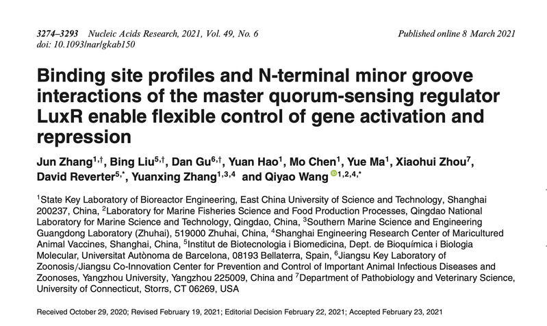 生物工程学院王启要教授课题组深入研究海洋弧菌LuxR能够高度灵活地激活或抑制众多靶基因表达的分子机制,阐明了病原弧菌如何感知菌群密度或其他理化信号进行协同调控群体行为、导致病害暴发的重要而基础的科学问题。