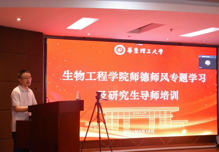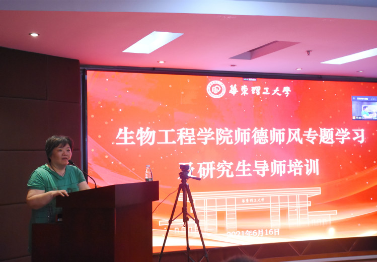 人事处党委教师工作部副部长张雪芹作师德师风建设专题报告,会议由生物工程学院党委副书记陆兵主持。生物工程学院党政班子成员、研究生导师现场参加培训,其他教师通过腾讯会议在线参加。