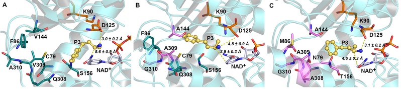 然而这类酶目前仍存在底物谱窄的问题,极大地限制了它们在光学纯手性胺合成中的应用。该课题组通过对酶与底物的构效关系分析,采用计算机辅助的蛋白质工程技术,确定了酶活性口袋中影响酶与大位阻底物结合的关键残基(Val144、Val309和Ala310),通过理性设计将其突变成侧链位阻较小的丙氨酸与甘氨酸,实现了酶底物活性口袋“容积”的拓展,使其对多种大位阻底物表现出“从无到有”的催化活性,极大地拓宽了该酶的催化底物范围。进而,通过筛选更多有益突变位点实现了该酶的进一步“人工进化”,酶活力相较于野生酶提升110倍,并且基于该突变酶实现了大位阻手性药物中间体的制备。此外,基于酶分子动力学模拟,研究者通过结合能、残基相互作用、基团间距离变化等因素分析,对该酶改造过程中的催化活性与稳定性的提升进行了机理阐述,为该类酶的后续改造与应用研究奠定了良好的基础。