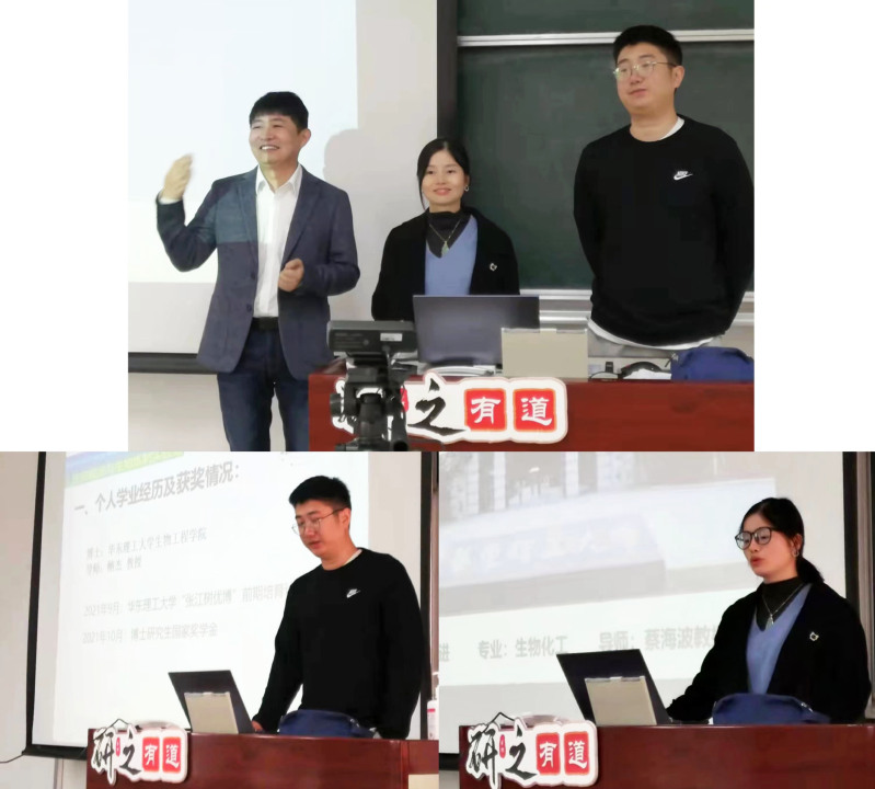 11月26日、12月3日,由研究生院主办,生物工程学院承办的两场“研之有道”系列分享沙龙在奉贤校区举行。本次活动邀请学院2021年度研究生国家奖学金获得者王进、蔡书善等优秀代表,分别就科研心得、文献阅读能力提升、科研生涯规划、双创及社会实践等方面同研究生们进行了分享和交流,现场气氛热烈。本次沙龙由学院研究生会学术部霍传富、罗智坤担任主持人,奉贤校区研究生辅导员张佼老师、兼职辅导员陈雨蒙老师出席,线上腾讯会议同步开放,共计100余人次参与此次系列活动。