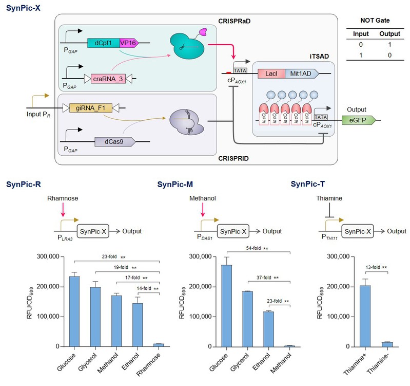 高水平、可调控的基因表达,对于生物医药和生物制造产业中的蛋白高效率、高质量生产极为重要。如何设计和开发兼具高表达强度和灵活调控特性的新型表达系统,是生物工程和合成生物技术所面临的关键问题和重要目标之一。酵母作为人们熟知的一种真核微生物,在食药方面的应用已有悠久的历史,在现代蛋白生产和生物合成方面也有非常广泛的应用。甲基营养型酵母——巴斯德毕赤酵母,因其生长密度高、蛋白表达强、遗传稳定好、糖基化修饰温和等优点,在学术研究和工业生产中均展现了很好的应用效果,已经成为重组蛋白表达的优选底盘宿主。同时,因其天然的甲醇高效利用特性,毕赤酵母近年来也成为碳一底物生物利用的高潜力微生物底盘宿主之一。据报道,毕赤酵母已用于超过5000种蛋白的表达应用,最近随着其生产的纳米抗体和完整单克隆抗体药物相继获得美国FDA批准和上市,使其应用潜力得到更为广泛的关注。然而,作为一种非模式生物,目前毕赤酵母有限的强启动子种类和单一的转录调控模式,却限制了其在更广阔场景下的应用潜力。