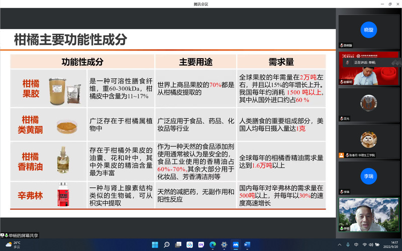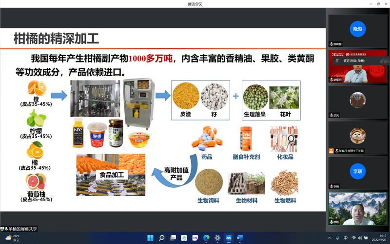 单杨院士深入浅出地介绍了柑橘功能性成分的研究进展。报告提到现阶段柑橘的精深加工产品主要依赖进口,柑橘副产物的生产具有十分广阔的市场前景。单杨院士详细介绍了柑橘的主要功能性成分——柑橘果胶、柑橘类黄酮、柑橘香精油、辛弗林,包括柑橘果胶提取改性技术、柑橘类黄酮的分离纯化和生物合成方法、柑橘香精油的提取方法、辛弗林的化学特性等内容,着重介绍了这4类物质的功能活性。单杨院士在报告中还分享了课题组取得的重要研究成果,为参会师生提供新的研究视角,大家受益匪浅。