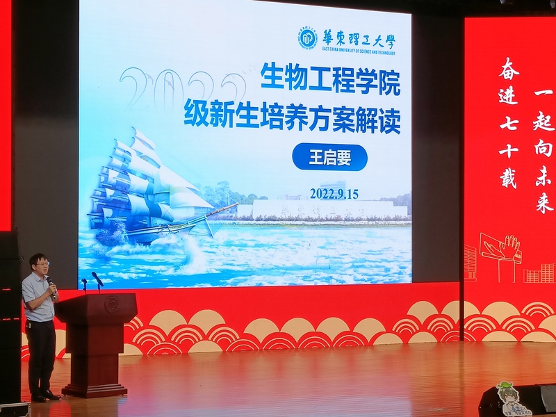 9月15日傍晚,生物工程学院2022级新生开学典礼在奉贤校区大学生活动中心隆重举行。生物工程学院党委书记吴辉,院长庄英萍,副院长王启要等学院领导和教师代表出席开学典礼。学院党委副书记左鹏主持开学典礼。