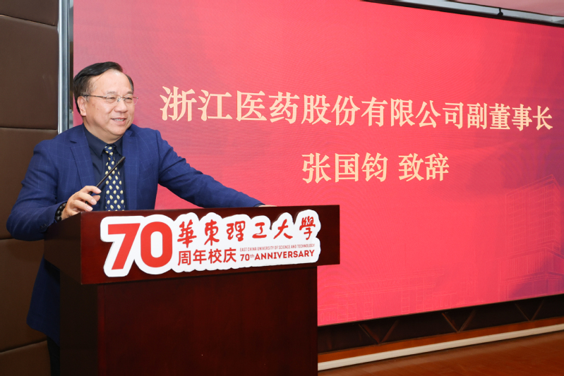 阎海峰代表学校对浙江医药股份有限公司和张国钧校友个人慷慨捐赠表达了衷心的感谢。他表示,生物医药产业是上海“中国制造2025”和战略性新兴产业的重点发展领域,国家正加快发展生物医药产业,做大做强生物经济。今天到会的生物工程学院老师和同学,要抓住生物医药大发展的这个机遇,肩负起“健康中国2030”的伟大使命,贡献磅礴的青春力量。同时,他也对浙江医药在产业升级、人才培养、科技创新等方面作出的杰出贡献表示敬意。