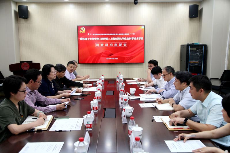 为深入开展学习贯彻习近平新时代中国特色社会主义思想主题教育走深走实,推动党建与事业发展深度融合,6月19日,生物工程学院院长叶邦策、党委书记吴辉、党委副书记左鹏和副院长王启要、刘琴、郑高伟及党政办公室相关同志赴上海交通大学生命科学技术学院调研。上海交通大学生命科学与技术学院院长冯雁、党委书记顾建平、党委副书记王鑫和副院长李志勇、张晓君及相关同志参加调研座谈。调研座谈会由冯雁主持。