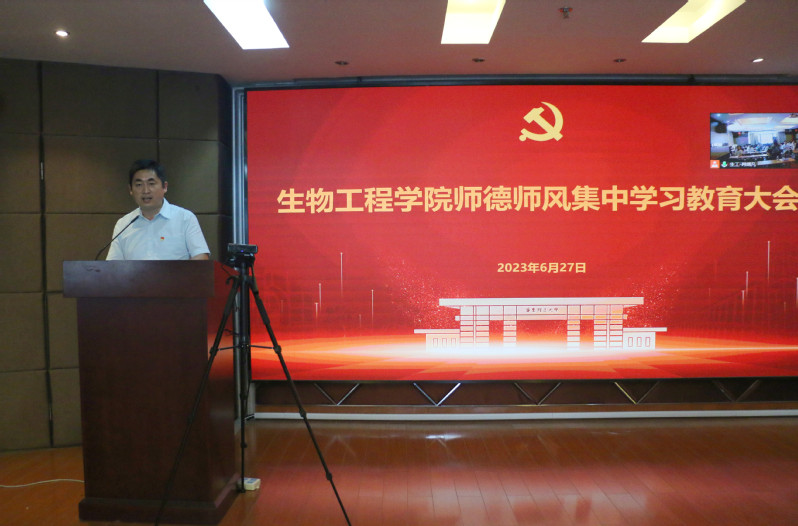 为深入开展学习贯彻习近平新时代中国特色社会主义思想主题教育走深走实,加强新形势下师德师风建设,6月27日,生物工程学院召开师德师风集中学习教育大会,党委书记吴辉作主题报告,院长叶邦策出席会议并讲话,学院全体教师参会,会议由党委副书记左鹏主持。