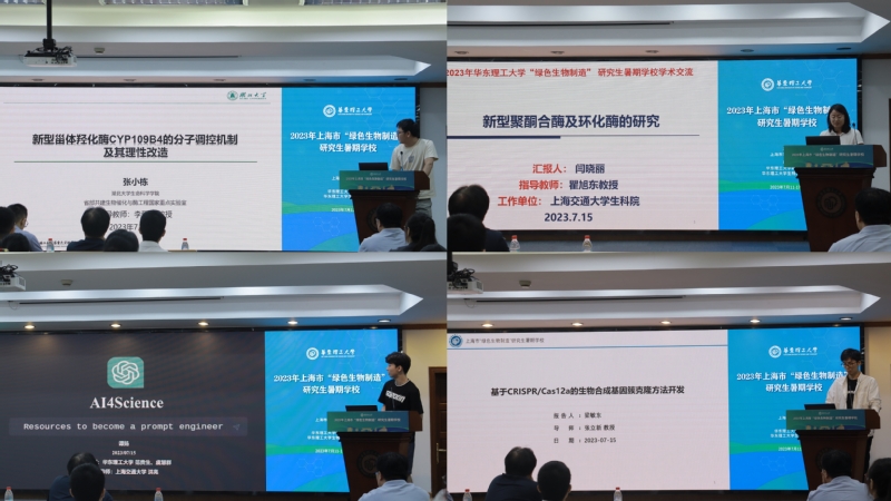 大学叶邦策教授、庄英萍教授、许建和教授、赵黎明教授、赵玉政教授十位国内知名专家,为大家做精彩的学术报告。报告涉及“数字合成生物学” “Natural Product Synthetic Biology:From Bacteria to Plant” “合成生物学产业发展与智能生物制造” “科学方法论与创新思维” “风口和机遇:合成生物产业的发展趋势”、“从ChatGPT到蛋白质工程通用大模型” “细胞代谢监测示踪与生命健康”“先进分离技术与生物制造”“脂肪酸的生物炼制”和“绿色生物制造让生活更美好”。这些报告引起了师生们浓厚的学术兴趣,现场气氛十分活跃。同学们纷纷表示,本次研究生暑期学校帮助他们实现了与领域专家近距离学术交流与探讨,促使他们更加了解最新的研究动态和学科前沿。