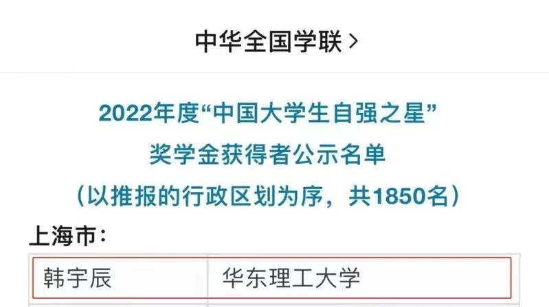 2022级硕士研究生韩宇辰入选,荣获“中国大学生自强之星”奖学金。