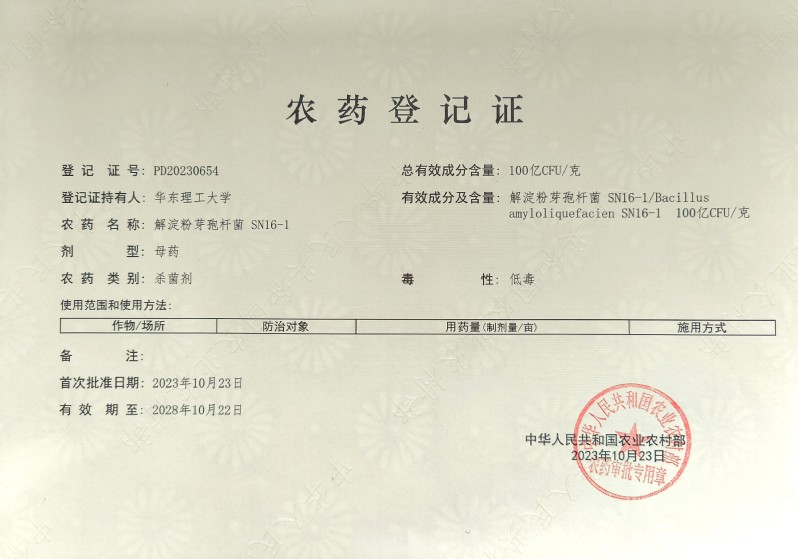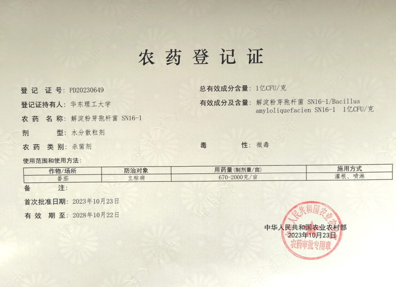 获得的2个新农药登记为生物反应器工程国家重点实验室王伟教授团队研发的新型生物农药:100亿CFU/克解淀粉芽孢杆菌SN16-1原药(登记证号PD20230654)和1亿CFU/克解淀粉芽孢杆菌SN16-1水分散粒剂(登记证号PD20230649)。
