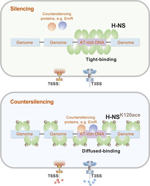 如果将原始的细菌基因组比作细菌内部的原住民,那么细菌的进化主要就是伴随着水平基因转移元件 (入侵者) 不断融合到原住民之间,赋予或增强细菌致病性和环境适应性等特性。典型的入侵者,如三型分泌系统(T3SS)、六型分泌系统(T6SS)、抗性基因和原噬菌体,能够加速普通细菌向病原菌跃迁。然而,这些入侵者会侵占原住民的生存资源,原住民派出守卫者类组蛋白H-NS沉默入侵者的表达。当病原菌需要入侵者如T3/T6SS发挥功能时,需要抵抗守卫者H-NS介导的沉默。研究团队先前报道了原噬菌体来源的抗沉默蛋白EnrR可以直接驱逐H-NS,激活T3/T6SS表达(Nucleic Acids Research, 2022)。进一步,类组蛋白H-NS自身是否会发生类似组蛋白的翻译后修饰,从而转变对入侵者的沉默状态,即是该研究的关键问题。