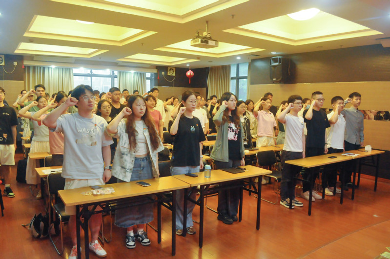 在左鹏带领下,全体毕业生党员举起右拳,面对党旗,重温入党誓词,铿锵有力的宣誓声在耳边回响,激励着全体党员不忘初心、牢记使命,坚定信念、勇往直前!