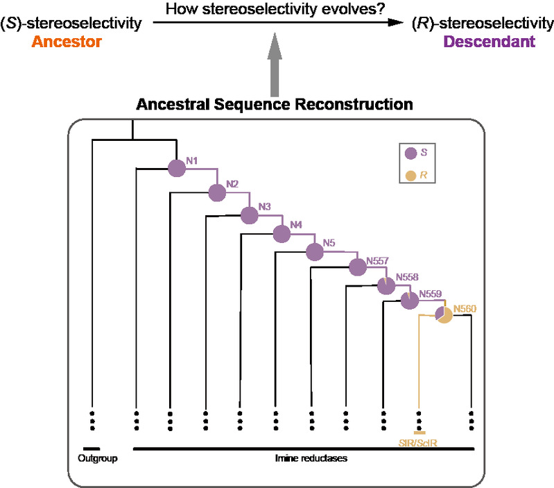 酶是如何演化出多种多样的生物学功能一直是分子演化研究中的核心科学问题之一,阐明酶学性质的演化模式不仅有助于回答演化生物学中的关键科学问题,还能为它们的理性化蛋白工程提供重要的指导作用。酶的立体选择性对于生命的维持和不对称生物催化反应都具有十分重要的作用,但关于立体选择性演化历史的研究还十分缺乏。针对立体选择性反转的传统定向进化的实验方法都需要构建及筛选大量的突变体库,难以高效且快速鉴定影响立体选择性的关键性位点。因此,我们需要一种全新的研究策略来规避上述问题。