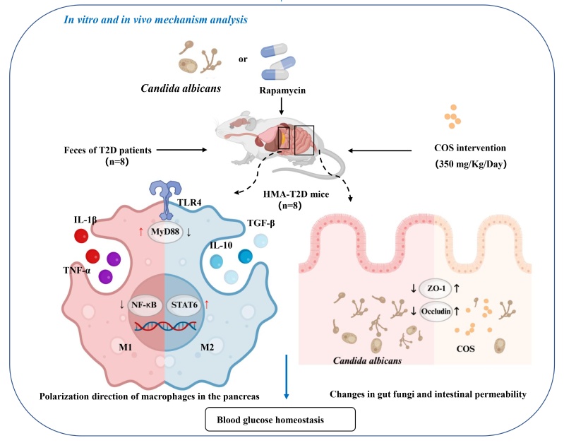 2021年全球成年糖尿病患者人数达到5.29亿。据推测,到2050年,糖尿病患者预计增至13.1亿。胰岛细胞移植(Islet Cell Transplantation,ICT)是目前根治1型和2型糖尿病的有效手段。由于术后抗生素、免疫抑制剂等药物因素导致炎症反应,引起移植受体肠道菌群紊乱以及肠屏障破坏,易造成移植后的胰岛细胞发生丢失或功能障碍。这种现象严重影响了胰岛细胞移植的成功率和术后血糖调节效果,是现阶段胰岛细胞移植临床上面临的难题。实验室前期研究发现壳寡糖(Chitooligosaccharides,COS)可以减少糖尿病小鼠胰腺的免疫浸润反应,推测COS干预可能有助于降低术后炎症,提高细胞移植成功率。本研究主要解析了2型糖尿病患者胰岛细胞移植前后肠道中真菌群落变化,揭示了Candida albicans是胰岛细胞移植后发生胰岛炎症的潜在原因之一;发现COS可通过MyD88/NF-κB-STAT6通路介导巨噬细胞极化来调节胰岛炎症和相关因子水平,同时修复肠屏障,减少有害菌Candida albicans的丰度,缓解胰岛移植后的胰岛炎症,有助于血糖平衡,为胰岛细胞移植患者术后管理和日常保健提供了新的干预策略。