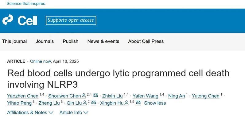 大学刘琴教授团队联合空军军医大学附属西京医院胡兴斌副教授团队,揭示了一种红细胞程序性死亡的新机制。北京时间4月18日,国际期刊Cell(《细胞》)以“Red blood cells undergo lytic programmed cell death involving NLRP3”为题,发表了这一研究成果。