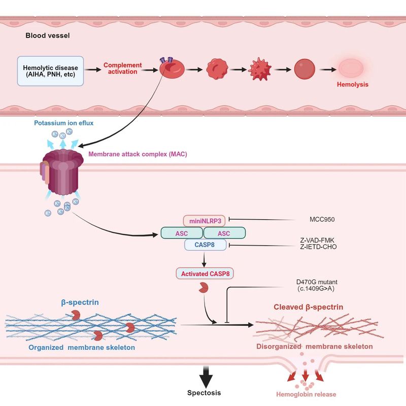 为了验证这一机制,团队进一步采用NLRP3和caspase-8特异性激活剂/抑制剂进行干预实验。研究首次证实,补体激活可触发红细胞内miniNLRP3-ASC-caspase-8信号通路级联反应,继而介导下游核心作用靶点血影蛋白β亚基(β-spectrin)的酶切裂解。作为维持细胞膜骨架的重要组成部分,β-spectrin的酶切降解直接导致膜骨架解体,由此引发溶血。研究团队将这一新型程序性死亡方式命名为“spectosis”。
