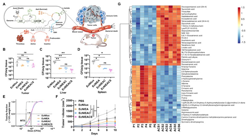 研究团队首先通过生物信息学筛选,开发了一种不受葡萄糖等肿瘤微环境抑制的新型乳酸调控元件和传感器,使工程菌能够精准响应肿瘤组织的乳酸浓度。随后耦合“感知-响应-繁殖”基因回路,使工程菌仅在肿瘤微环境中存活。工程菌组织脱靶降低2-3个数量级,最大耐受剂量提升3倍。进一步引入基于群体感应的α-溶血素自调控释放回路,以增强抗肿瘤效果。此外,由高水平乳酸诱导工程菌产生凝固酶(Coa)诱导了瘤内血栓形成。非靶向代谢组表明,血栓形成剥夺了肿瘤的营养和氧气供应,诱发肿瘤代谢重编程,协同提高了工程菌抗肿瘤效果。此外,瘤内栓塞减少了细菌和毒性蛋白泄露的风险。这种自调控的工程活菌药物肿瘤抑制率达90%,显著延长了结直肠癌荷瘤小鼠的存活时间。总之,智能化基因线路赋能的活体疗法为肿瘤的精准高效治疗提供了新的工具。