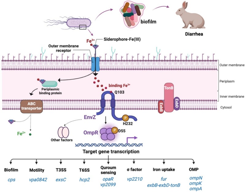 研究团队首次发现该菌的双组分系统EnvZ/OmpR除了感知渗透压,还具有感知三价铁离子(Fe³⁺)的特殊能力。通过系统的分子生物学实验,研究人员证实EnvZ蛋白的周质结构域能够特异性识别并结合Fe³⁺,这一过程依赖于关键氨基酸位点—103位谷氨酰胺 (Q103)。EnvZ铁离子结合触发其自磷酸化,进而激活下游OmpR相关调控网络,最终协调细菌的生物被膜形成、运动能力和毒力表达等过程。进一步,团队采用多组学联用策略,通过RNA-seq与ChIP-seq分析,绘制了EnvZ/OmpR调控网络的完整图谱。研究发现,外膜蛋白编码基因ompN的表达受铁信号严格调控,在envZ缺失菌株中表达量骤降21倍。进一步实验证实,ompN是调控生物被膜形成的关键效应分子。