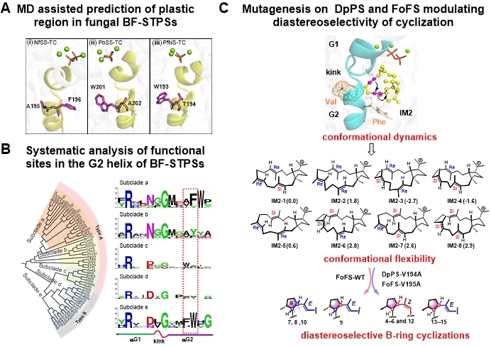 图片说明:(A)分子动力学模拟辅助预测萜类环系演化的可塑区;(B)系统分析双功能萜合酶G2-helix的功能氨基酸位点;(C)调控DpPS和FoFS催化环化反应的对映选择性。
