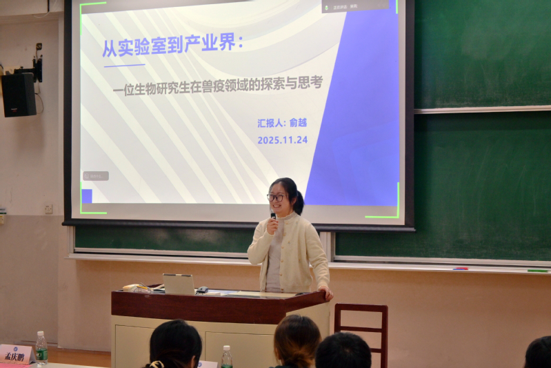 俞越以“一位生物研究生在兽疫领域的探索与思考”为题,分享了自己从学术科研到产业应用的转型经历。她结合兽疫防控领域的技术转化与行业实践,讲述了如何精准定位个人优势、把握就业机遇,为同学们拓展职业视野、明确发展方向提供了宝贵参考。
